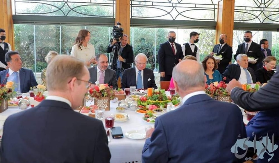 حضر جلالة الملك كارل السادس عشر غوستاف ملك مملكة السويد وجلالة الملكة سليفيا ملكة السويد مأدبة غداء أقامها رئيسا مجلسي الأعيان فيصل الفايز والنواب أحمد الصفدي، اليوم الثلاثاء، تكريما لجلالتيهما.