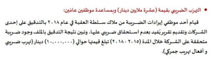 وبحسب التقرير السنوي للهيئة ، ساعد في هذا التهرب موظفين عامين إذ قام أحد موظفي الضريبة من ملاك سلطة العقبة في العام 2018 بالتدقيق على احدى الشركات وتقديم تقرير يفيد بعدم استحقاق ضريبي عليها.