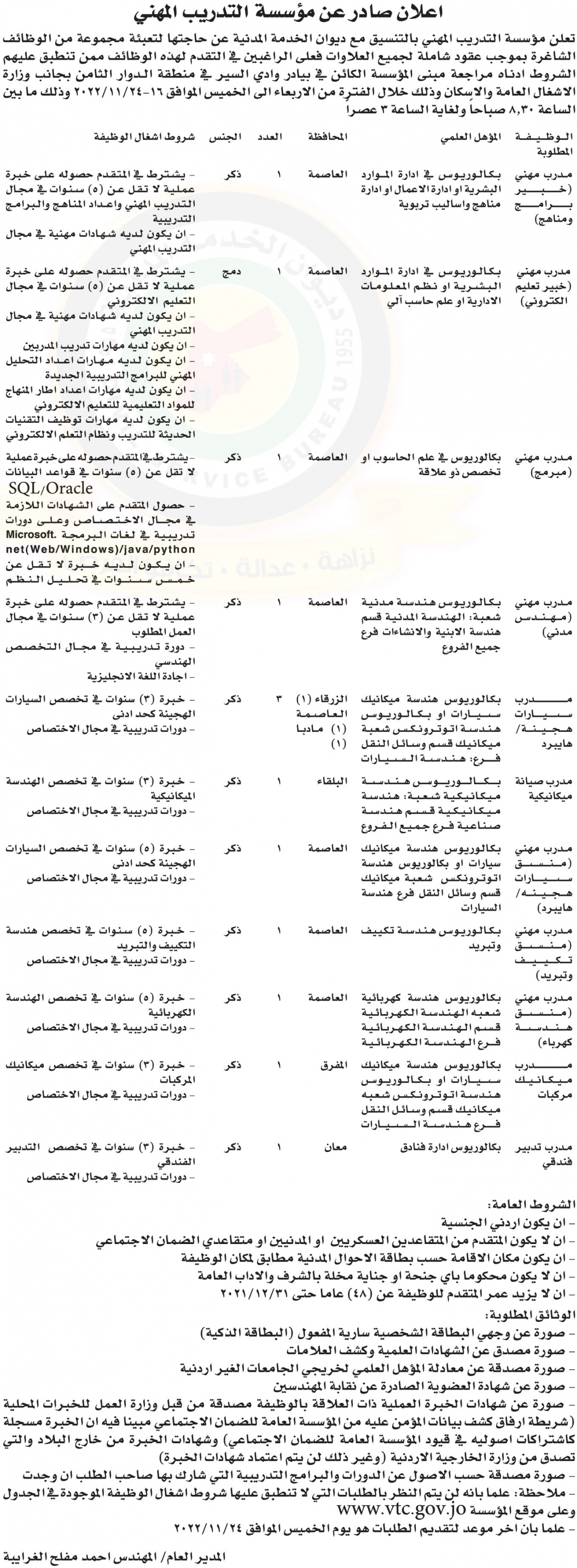أعلنت مؤسسة التدريب المهني بالتنسيق مع ديوان الخدمة المدنية حاجتها لتعبئة مجموعة من الوظائف الشاغرة لديها وفق الإعلان التالي :