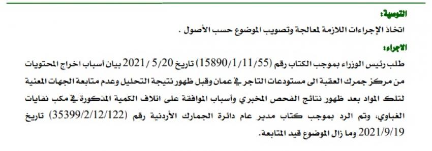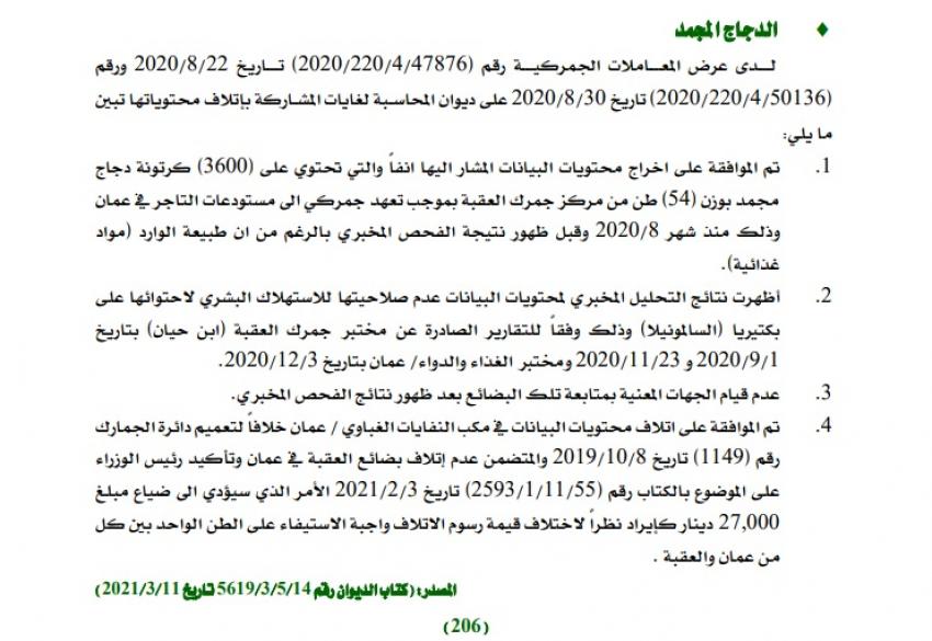 كشف تقرير ديوان المحاسبة لعام 2021 عن موافقة الجمارك على اخراج 3600 كرتونة دجاج مجمد بوزن 54 طنا من مركز جمرك العقبة بموجب تعهد جمركي إلى مستودعات التاجر في عمان قبل ظهور نتائج الفحص المخبري، رغم أن طبيعة الوارد مواد غذائية.