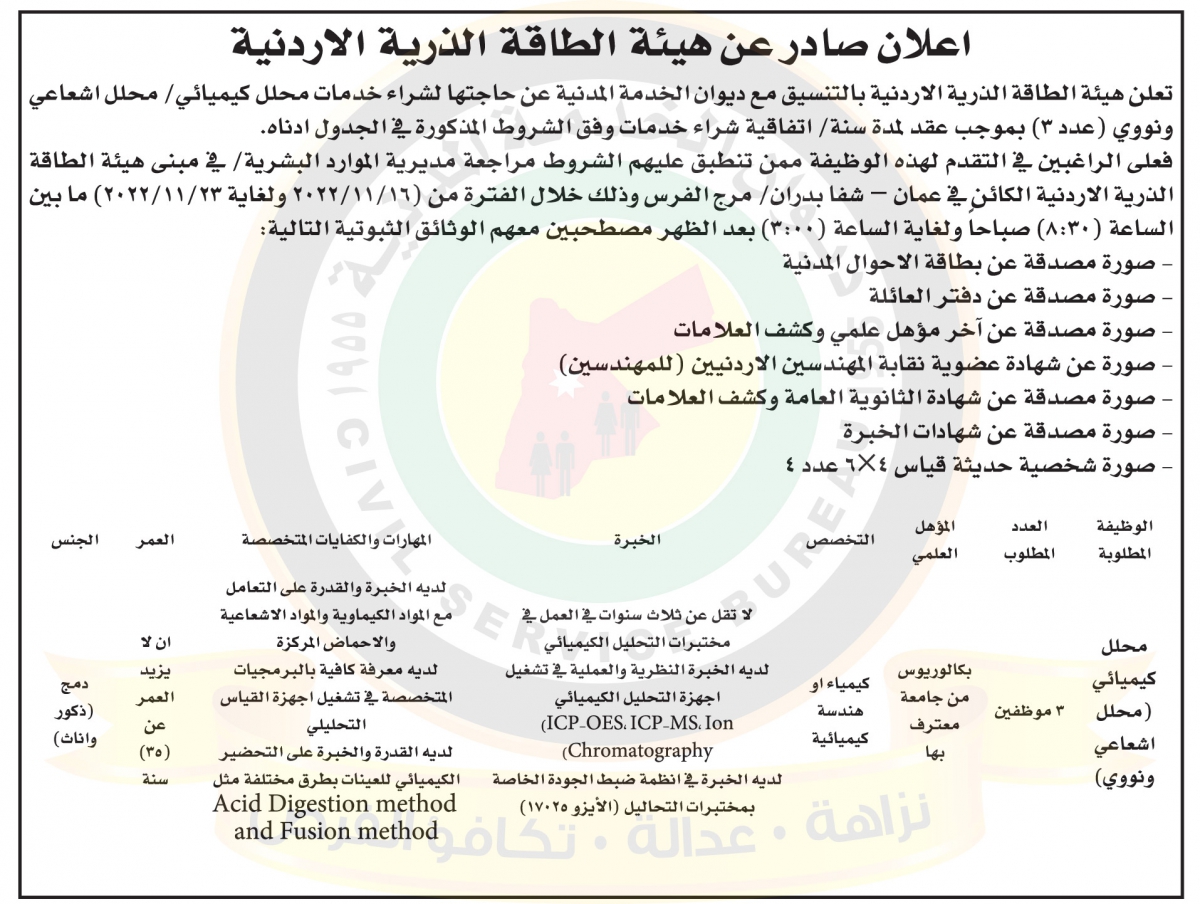 أعلنت هيئة الطاقة الذرية الأردنية بالتنسيق مع ديوان الخدمة المدنية حاجتها لشراء خدمات محلل كيميائي / محلل إشعاعي ونووي عدد 2 بموجب عقد لمدة عام وفق الإعلان التالي :