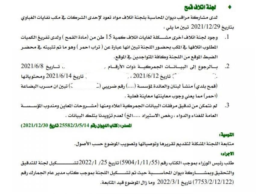 وقال تقرير ديوان المحاسبة، إن لجنة شكلت لغايات اتلاف 15 طنا من مادة القمح ولدى تفريغ الكميات المطلوب اتلافها في المكب بحضور اللجنة تبين أنها عبارة عن تراب أحمر.