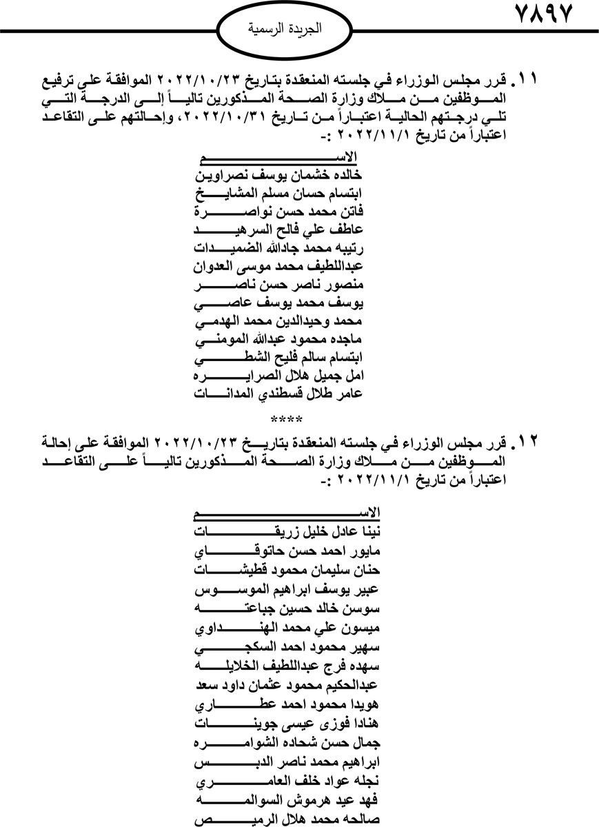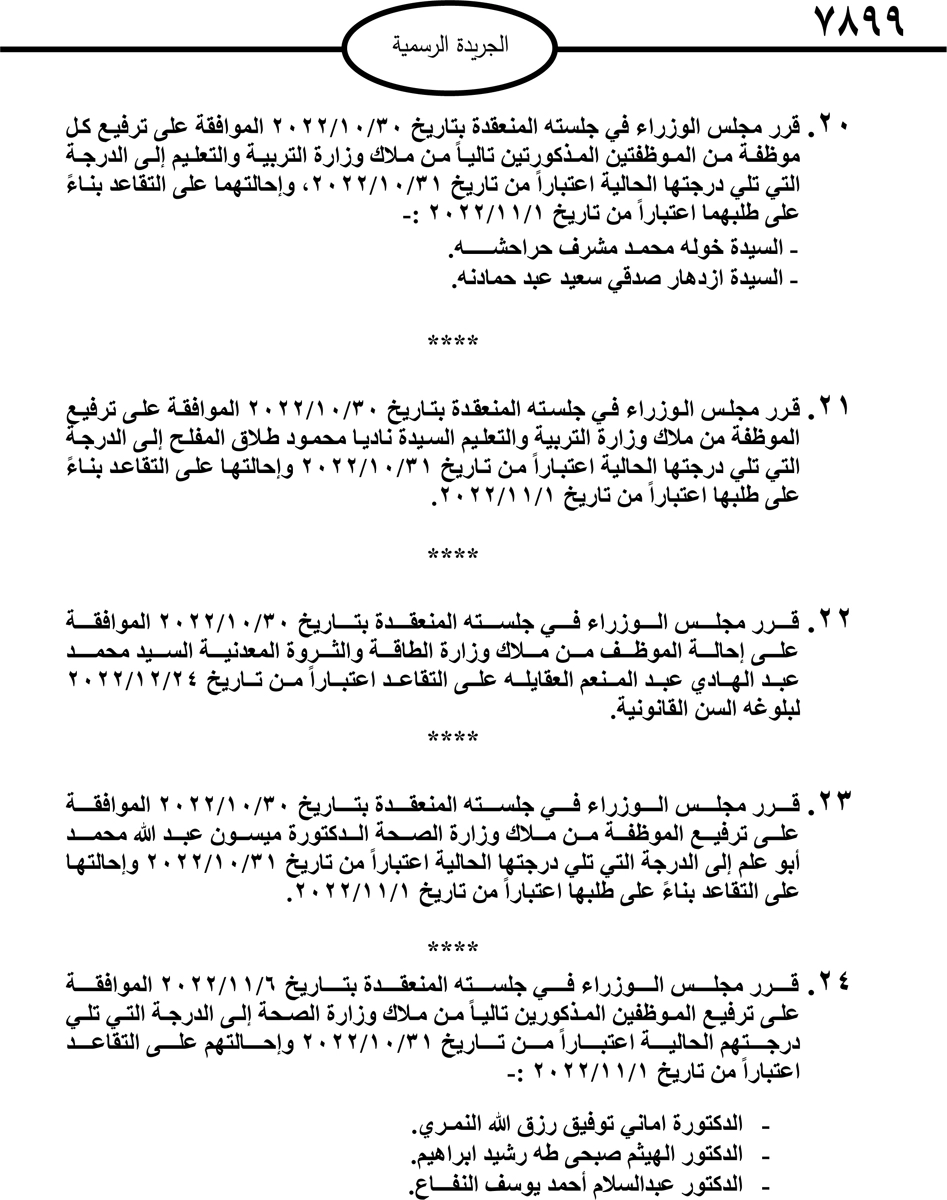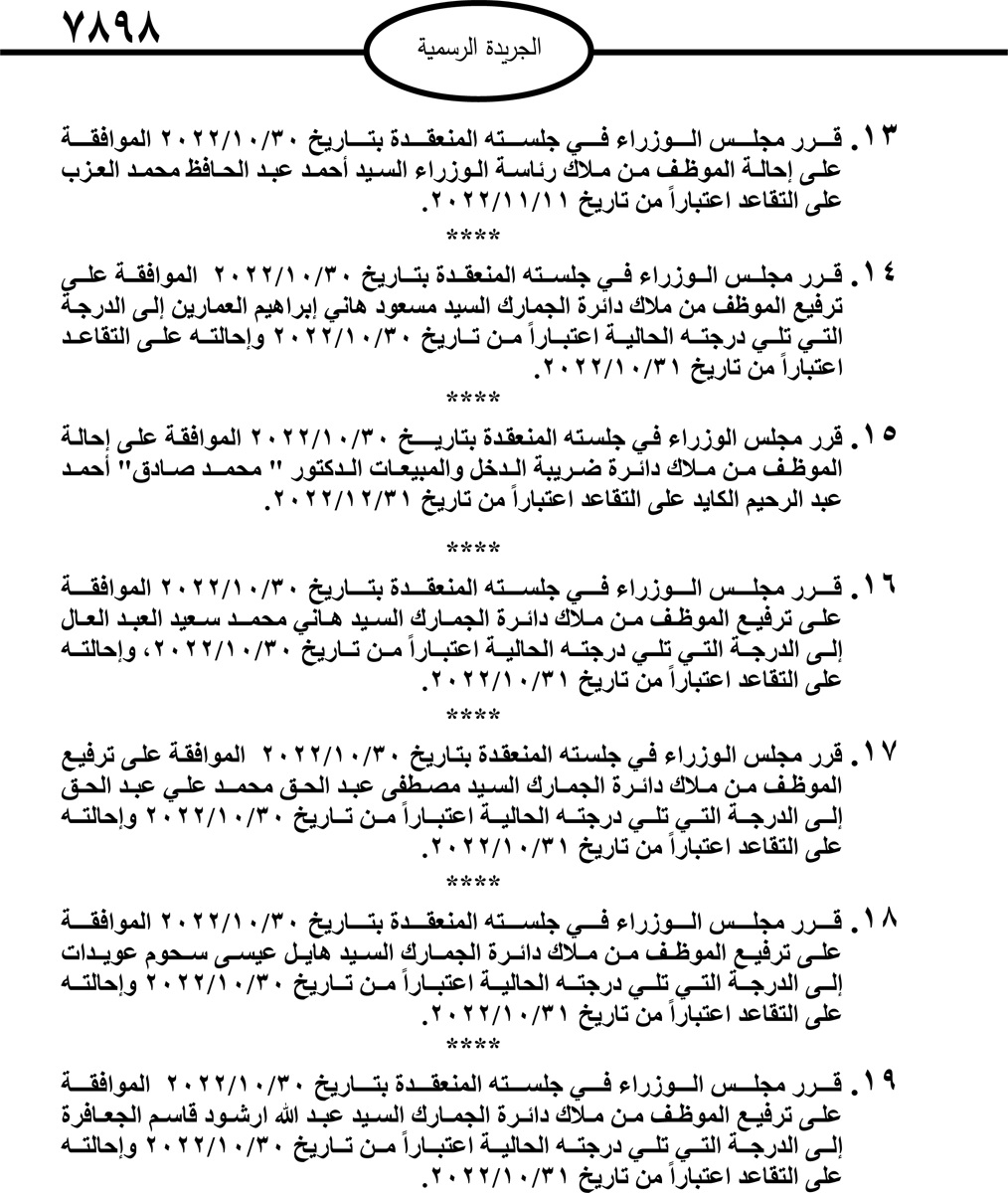 صدر في الجريدة الرسمية اليوم الاربعاء قرارات مجلس الوزراء بإحالة موظفين حكوميين الى التقاعد.