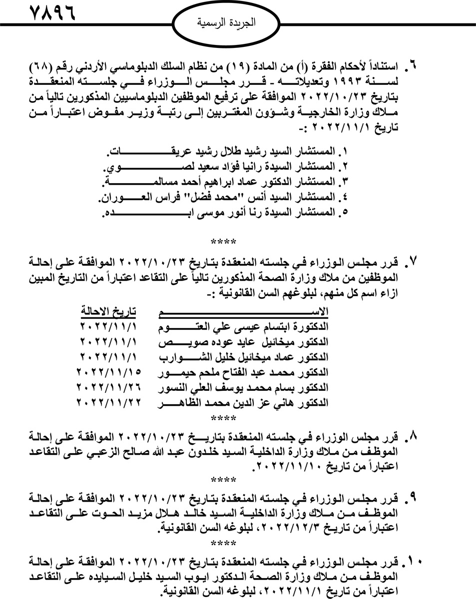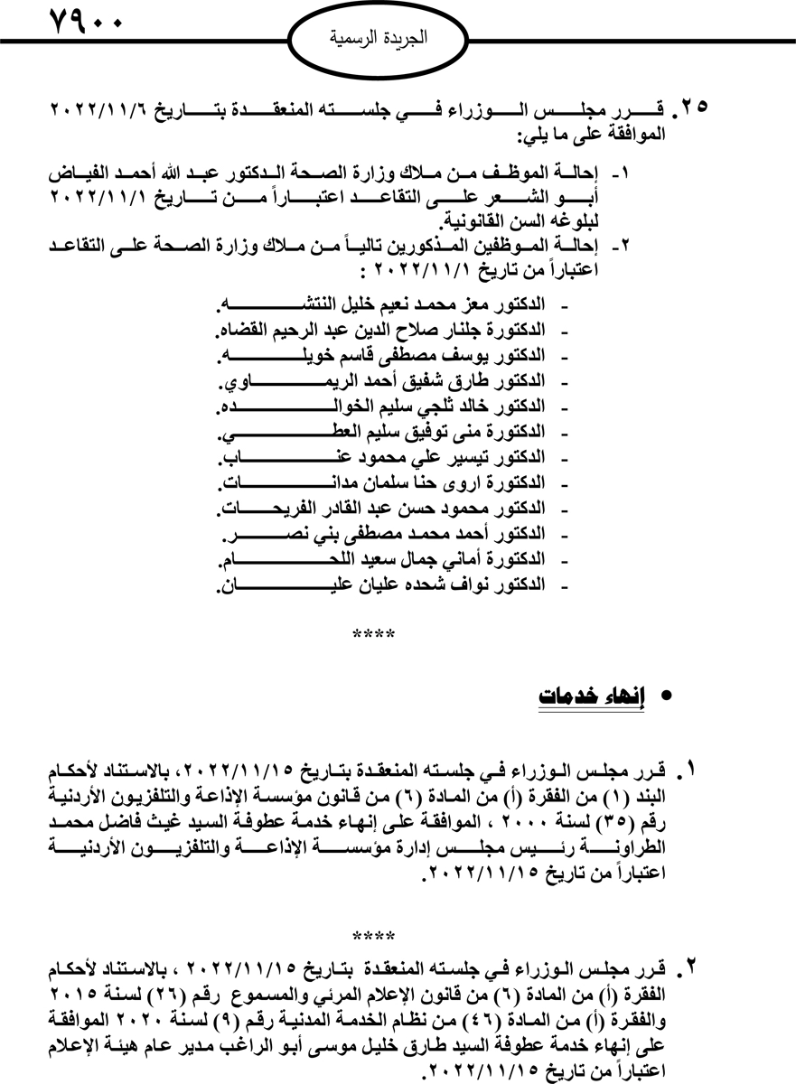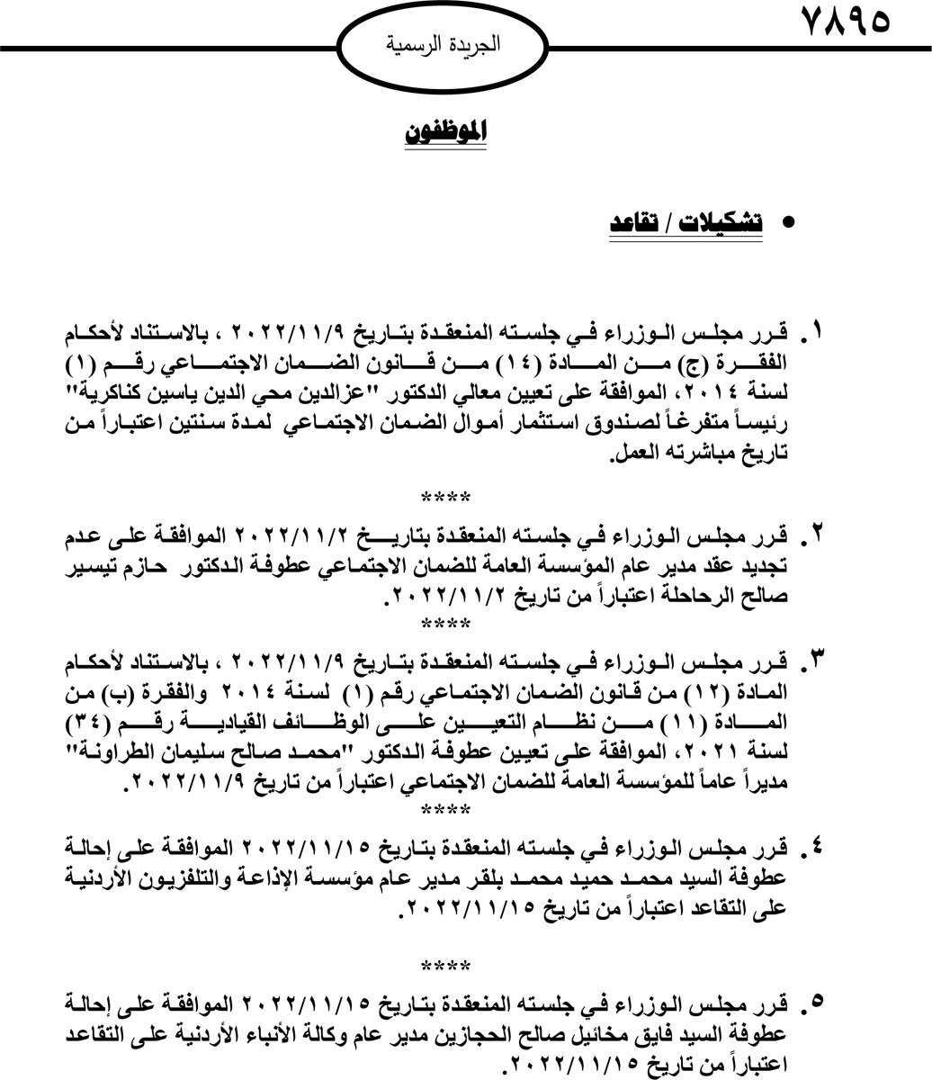 صدر في الجريدة الرسمية اليوم الاربعاء قرارات مجلس الوزراء بإحالة موظفين حكوميين الى التقاعد.