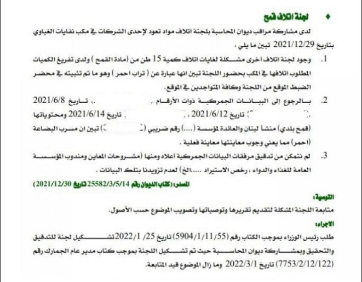 وأوضح تقرير ديوان المحاسبة، أن لجنة إتلاف شكلت لغايات اتلاف 15 طنا من مادة القمح ولدى تفريغ الكميات المطلوب إتلافها في المكب بحضور اللجنة تبين أنها عبارة عن تراب أحمر.