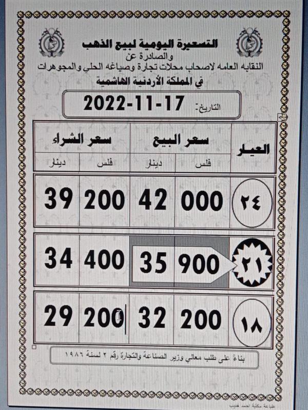 وبلغ سعر بيع غرام الذهب عيار 21 الأكثر طلبا 35.90 ديناراً لغايات شراء المواطنين، مقابل 34.40 دينارا لجهة البيع لمحال الصاغة.