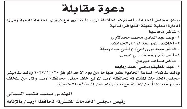 نيروز الإخبارية : أعلن مجلس الخدمات المشتركة لمحافظة إربد وبالتنسيق مع ديوان الخدمة المدنية و وزارة الإدارة المحلية التالي أسماؤهم لإجراء المقابلات الشخصية لغايات التعيين.