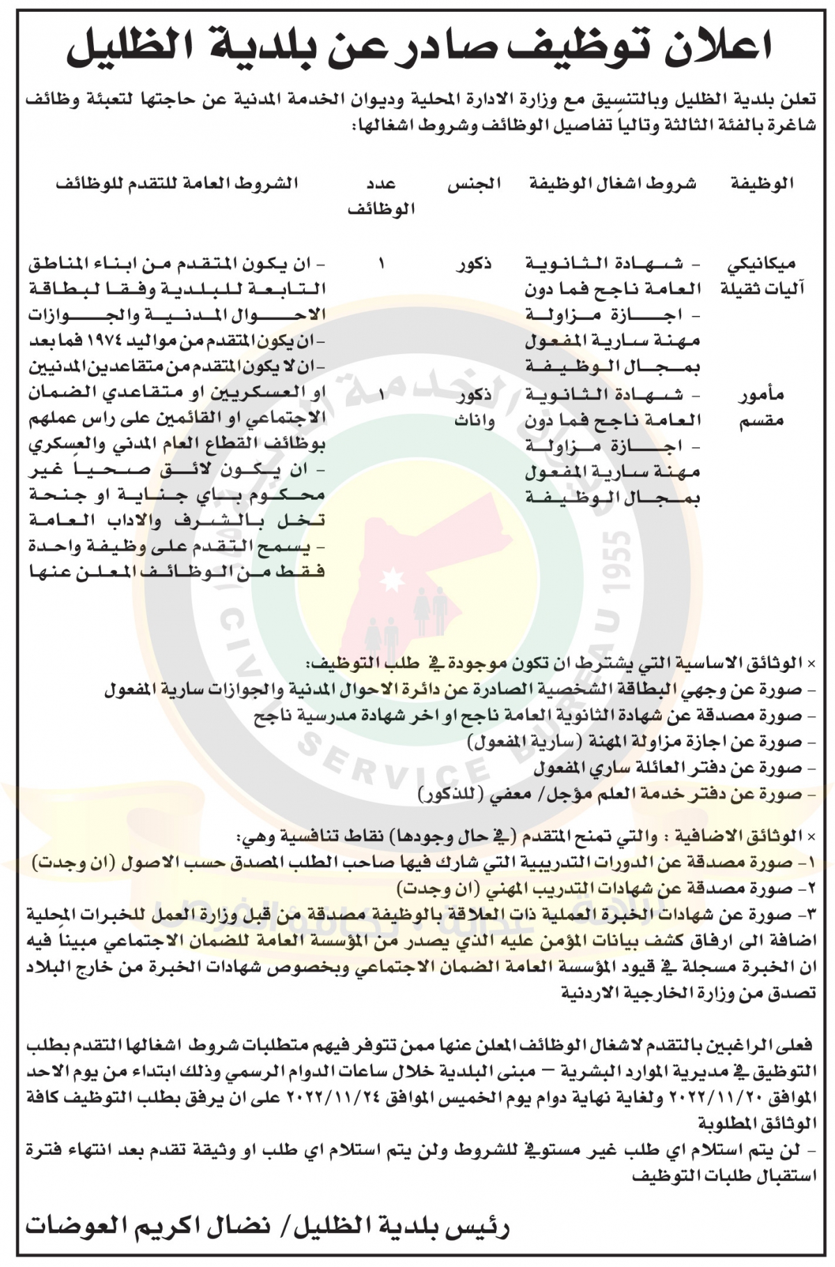 أعلنت بلدية الظليل وبالتنسيق مع وزارة الإدارة المحلية وديوان الخدمة المدنية حاجتها لتعبئة وظائف شاغرة بالفئة الثالثة وفق الإعلان التالي :