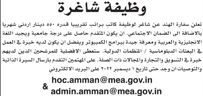 اعلنت سفارة الهند في الاردن عن شاغر مكتبي براتب 550 دينارا اردنيا .