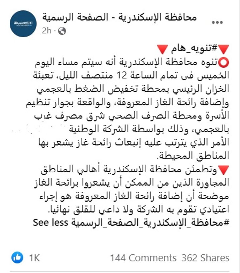 أصدرت محافظة الإسكندرية، شمال غرب العاصمة المصرية القاهرة، بيانًا بشأن احتمال انتشار رائحة غاز في شوارع المدينة الساحلية.