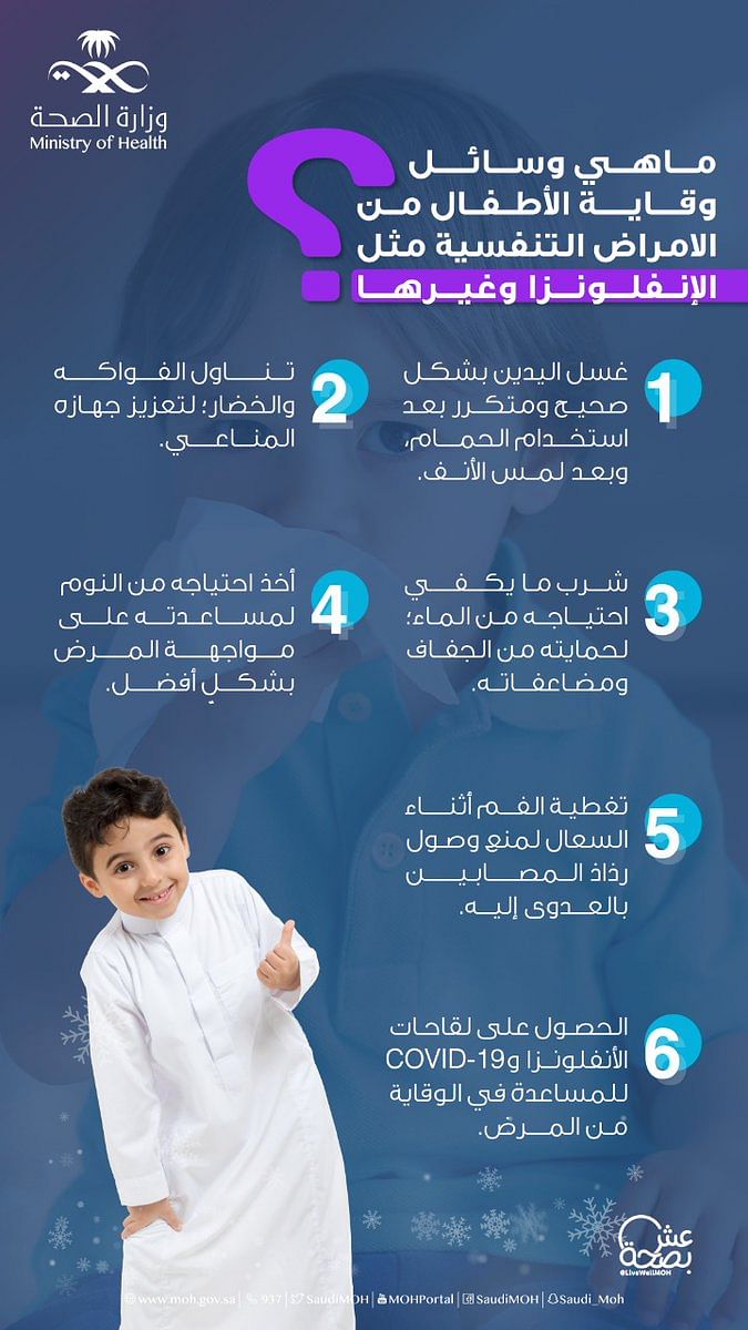 وأضافت الوزارة في إنفوجراف على حسابها بتويتر، أن النوم الكافي يساعد الطفل على مواجهة الأمراض بشكلٍ أفضل، مشددة على ضرورة تغطية الفم أثناء السعال لمنع وصول الرذاذ والعدوى، والحصول على لقاحات الإنفلونزا وكوفيد-19 للمساعدة على الوقاية من المرض.