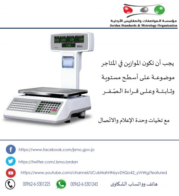 نيروز الإخبارية : دعت مؤسسة المواصفات والمقاييس الأردنية المواطنين إلى التأكد من وضع الموازين في المتاجر على أسطح مستوية وثابتة وعلى قراءة الصفر، وذلك لتجنب الوقوع بالغش أو التلاعب بالأوزان.