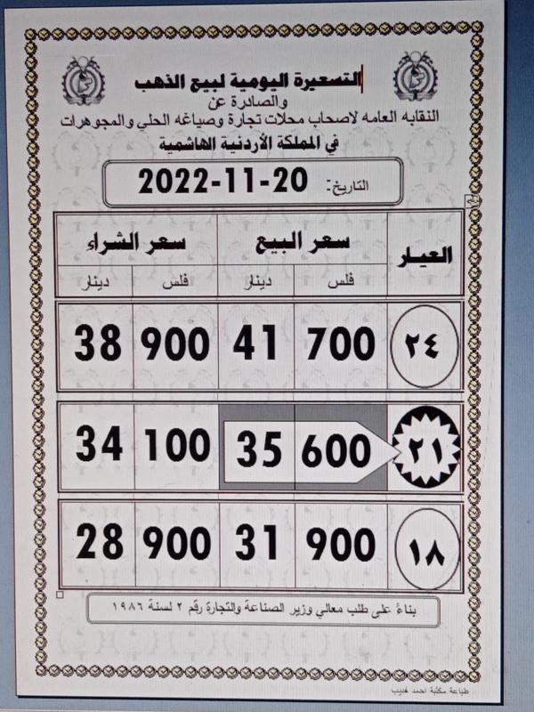 وبلغ سعر بيع غرام الذهب عيار 21 الأكثر طلبا 35.60 ديناراً لغايات شراء المواطنين، مقابل 34.10 دينارا لجهة البيع لمحال الصاغة.