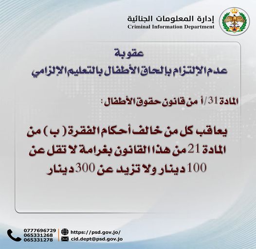 نيروز الإخبارية : أكدت وزارة التربية والتعليم على عقوبة عدم الإلزام بإلحاق الأطفال بالتعليم الإلزامي وفق المادة 31/أ من قانون حقوق الأطفال نقلاً عن إدارة المعلومات الجنائية .