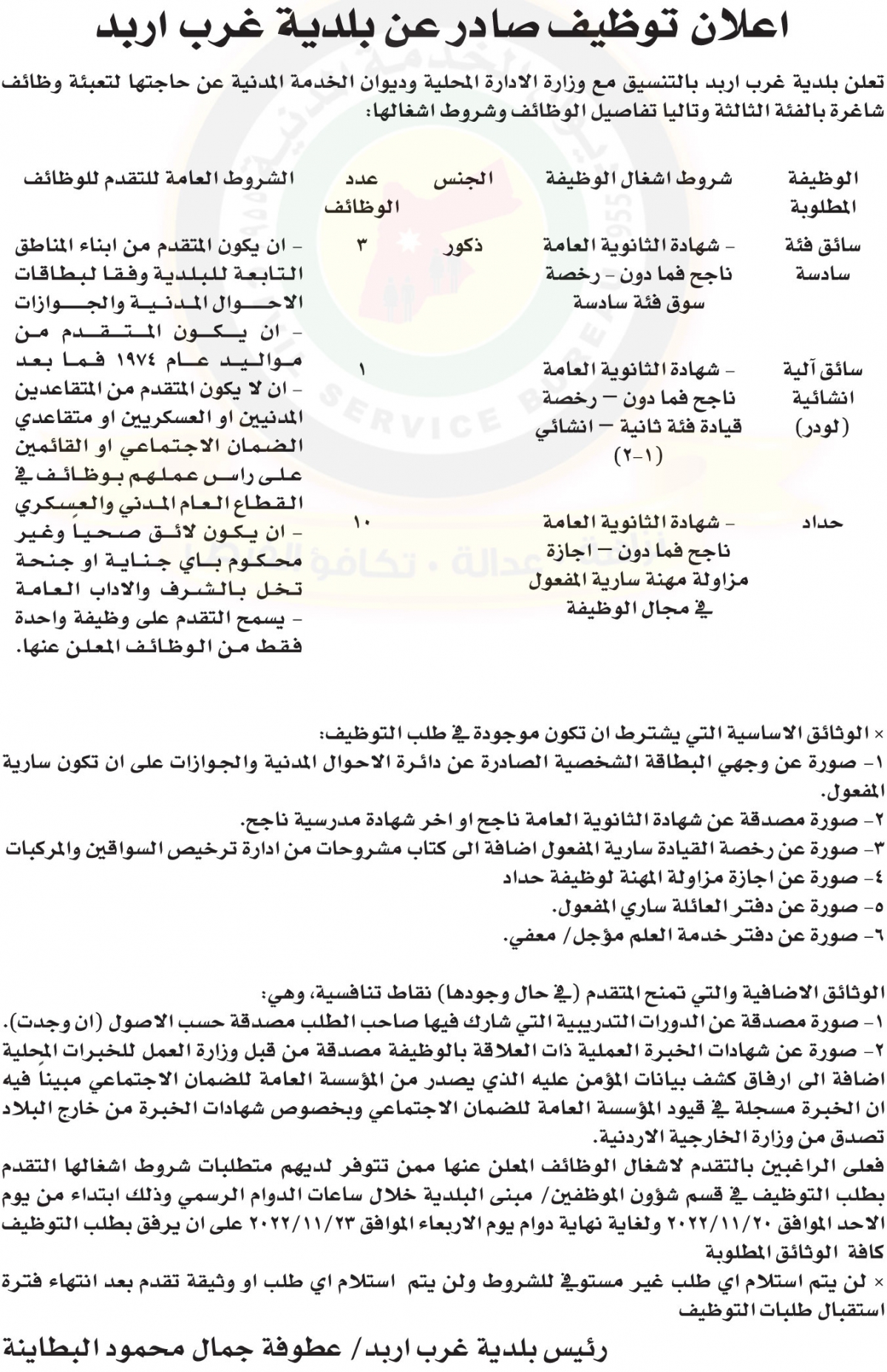 أعلنت بلدية غرب اربد بالتنسيق مع وزارة الإدارة المحلية وديوان الخدمة المدنية حاجتها لتعبئة وظائف شاغرة بالفئة الثالثة وفق الإعلان التالي :