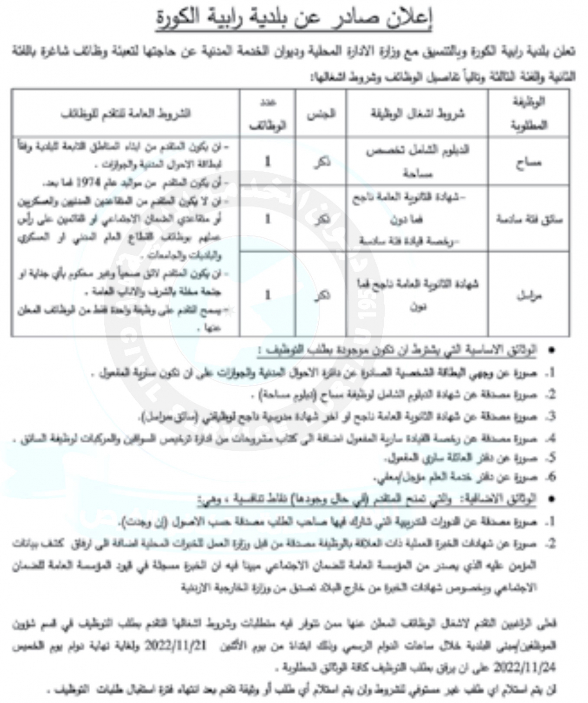 أعلنت بلدية رابية الكورة وبالتنسيق مع وزارة الإدارة المحلية وديوان الخدمة المدنية حاجتها لتعبئة وظائف شاغرة للفئتي الثانية والثالثة وفق الإعلان التالي :