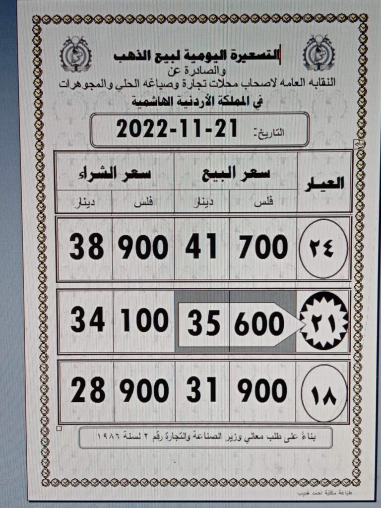 وبلغ سعر بيع غرام الذهب عيار 21 الأكثر رغبة من الأردنيين بالسوق المحلية عند 35.60 دينارا لغايات شراء المواطنين من محلات الصاغة.