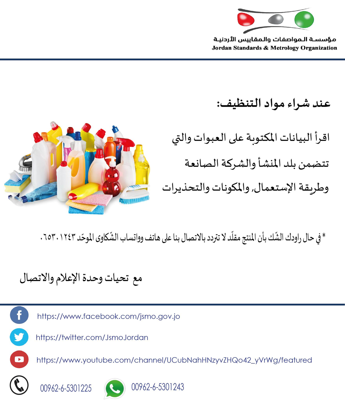 نيروز الإخبارية : وجهت مؤسسة المواصفات والمقاييس الأردنية نصائح هامة للمواطنين عند شراء مواد التنظيف.