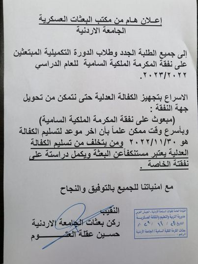نيروز الإخبارية : أعلنت الجامعة الأردنية اليوم الاثنين عبر صفحتها الرسمية عبر منصة "فيسبوك" ان على جميع الطلبة الجدد وطلاب الدورة التكميلية المبتعثين على نفقة المكرمة الملكية السامية للعام الدراسي 2022/2023 الاسراع بتجهيز الكفالة العدلية.