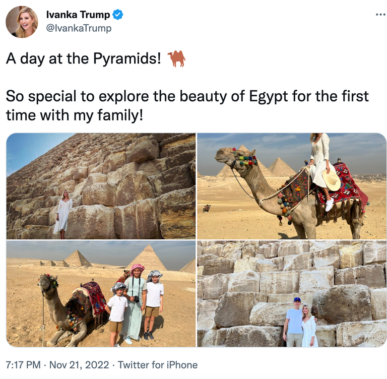 ونشرت إيفانكا صورا علقت عليها :"يوم في الأهرامات.. وقت خاص جدا لاستكشاف ‏جمال مصر لأول مرة مع عائلتي"‏.