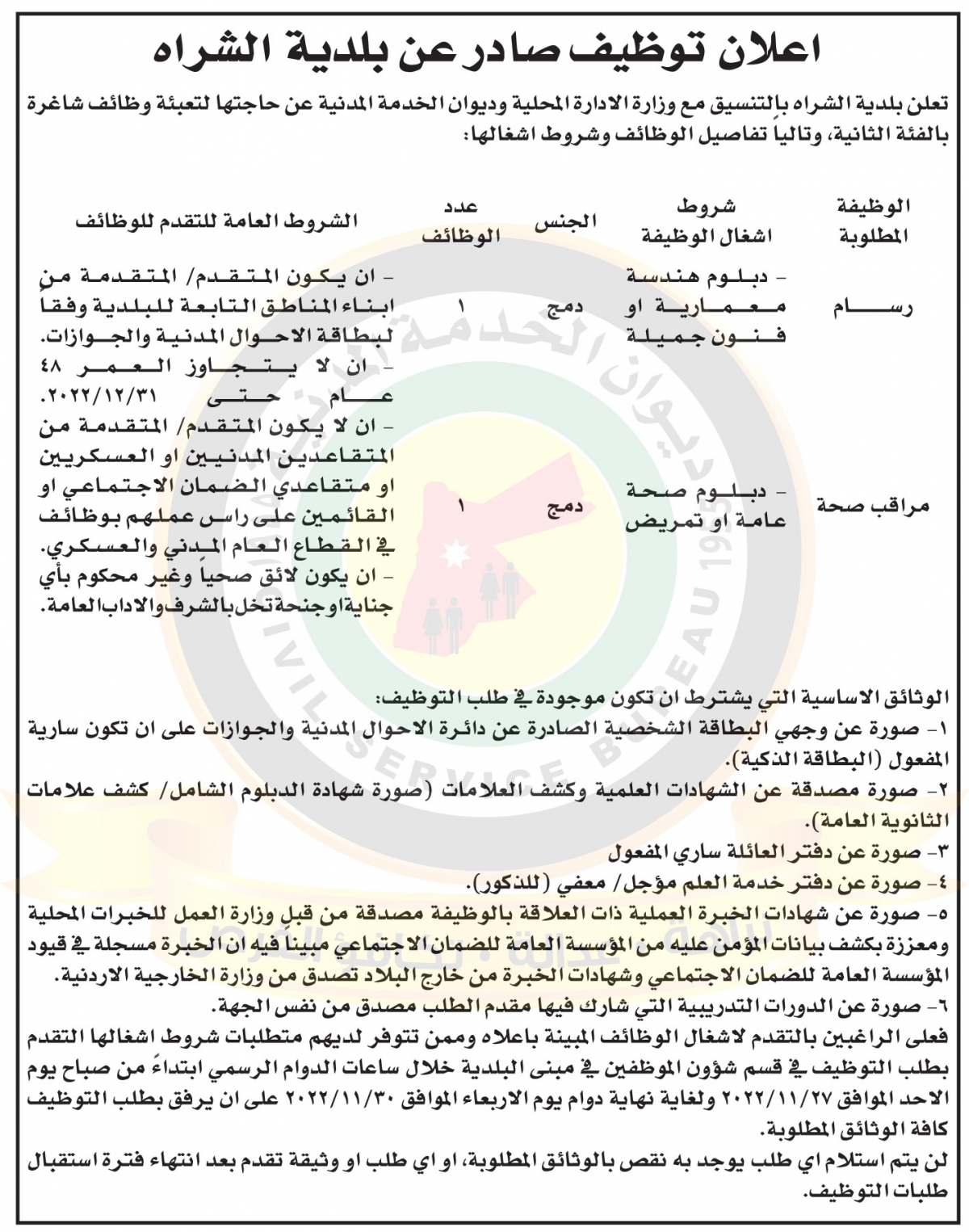 أعلنت بلدية الشراه بالتنسيق مع وزارة الإدارة المحلية وديوان الخدمة المدنية حاجتها لتعبئة وظائف شاغرة بالفئة الثالثة وفق الإعلان التالي :
