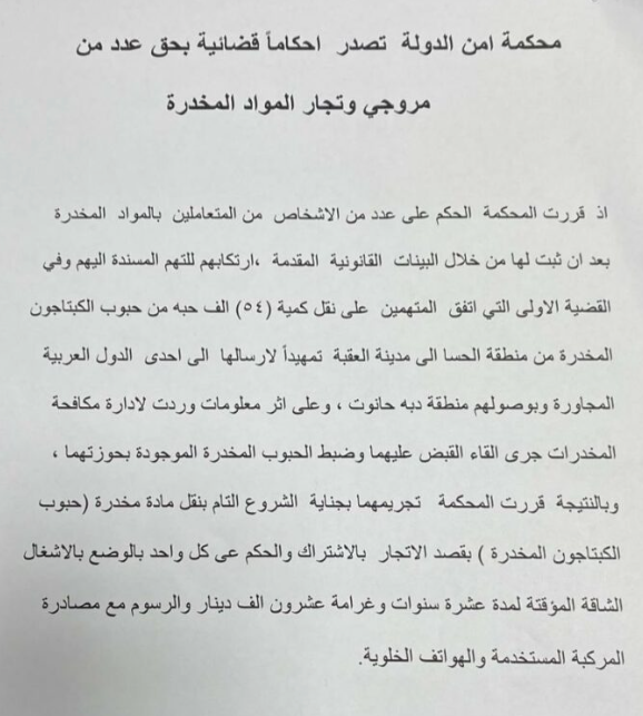 أصدرت محكمة أمن الدولة، الثلاثاء، حكما بالأشغال المؤقتة لمدة عشر سنوات على عدد من الأشخاص، حاولوا نقل 54 ألف حبة من الكبتاغون المخدرة  بقصد الاتجار داخل الأردن.