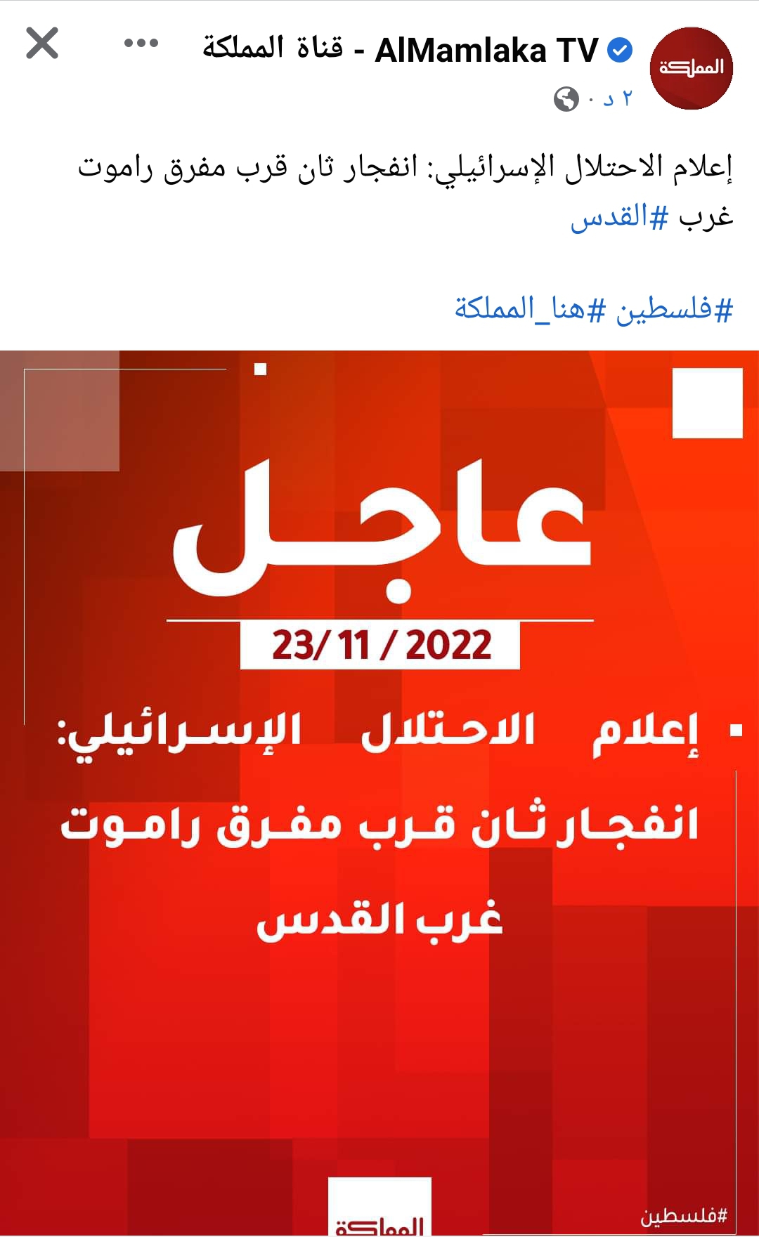 قالت قناة المملكة عبر صفحتها بفيسبوك أن إعلام الاحتلال الإسرائيلي قال إنه وقع انفجارًا ثان قرب مفرق راموت غرب القدس .