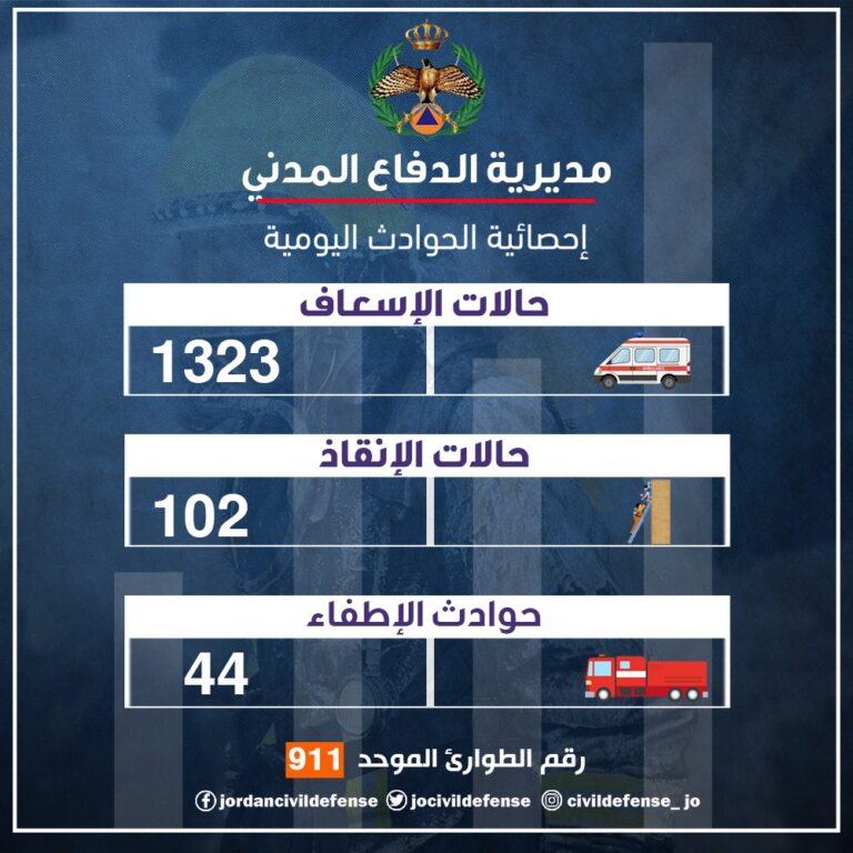: تعاملت مديرية الدفاع المدني خلال 24 ساعة الماضية مع (1323)حالة إسعافية مختلفة.