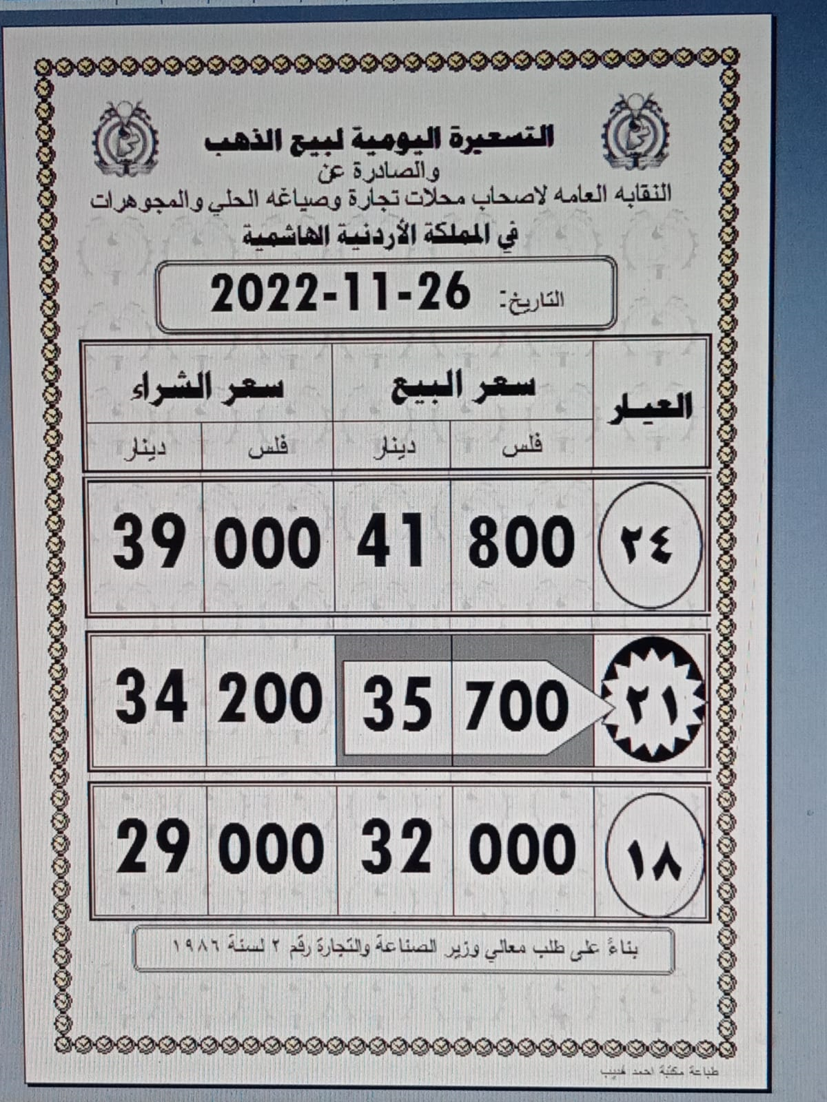 نيروز الإخبارية : بلغ سعر الذهب عيار 21 الأكثر طلبا من قبل الأردنيين، اليوم السبت، 35.7 دينارا لجهة الشراء من المحلات، مقابل 34.2 لجهة البيع، بحسب النقابة العامة لأصحاب محلات بيع وصياغة الحلي والمجوهرات.