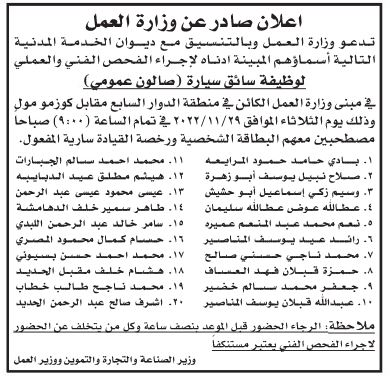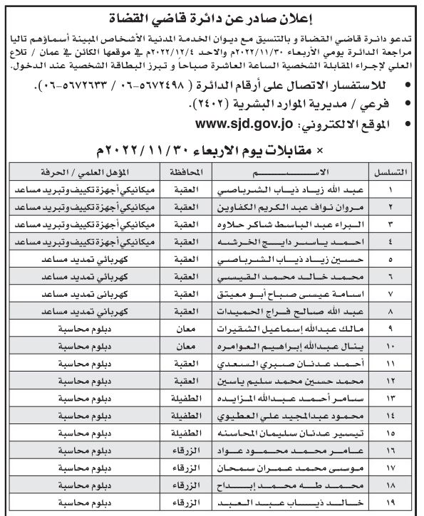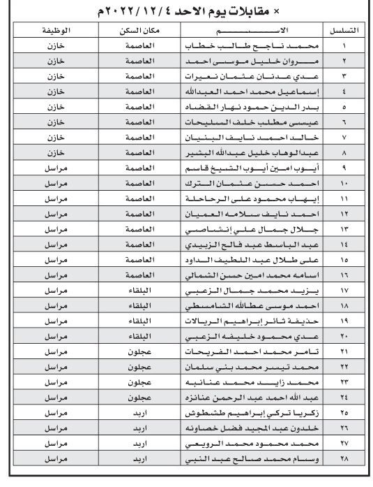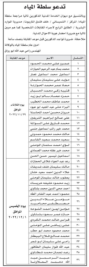 ودعت وزارة العمل المرشحين مراجعتها يوم الثلاثاء الموافق 29/11/2022 تمام الساعة 9 صباحا، فيما دعت دائرة قاضي القضاة المرشحين مراجعتها اعتباراً من يوم الاربعاء الموافق 30/11/2022 لغاية يوم الاحد 4/12/2022، وحددت سلطة المياه مواعيد المقابلات حسب الإعلان المرفق.