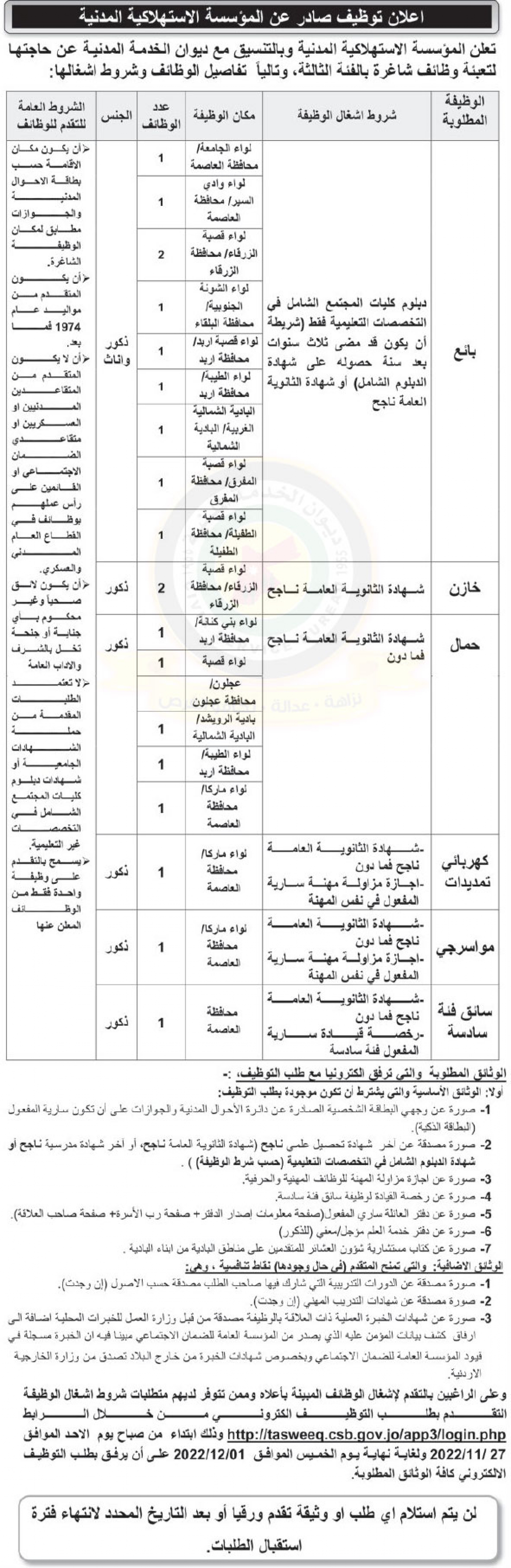 أعلنت المؤسسة الاستهلاكية المدنية وبالتنسيق مع ديوان الخدمة حاجتها لتعبئة وظائف شاغرة بالفئة الثالثة وفق الإعلان التالي :