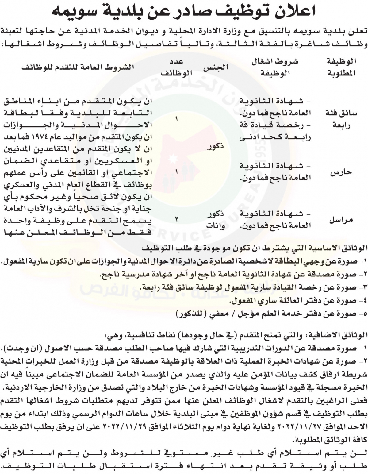 أعلنت بلدية سويمه بالتنسيق مع وزارة الإدارة المحلية وديوان الخدمة المدنية حاجتها لتعبئة وظائف شاغرة بالفئة الثالثة وفق الإعلان التالي :