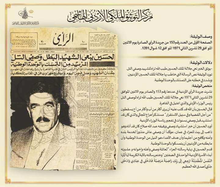 عرض مركز التوثيق الملكي الأردني الهاشمي، اليوم الاثنين، وثيقة بمناسبة الذكرى 51 لاستشهاد وصفي التل، تتضمن خبرا نُشر في العدد رقم 153 من جريدة الرأي الصادرة يوم الاثنين الموافق 29 تشرين الثاني 1971 الموافق 12 شوال 1391.