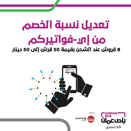 وبينت صفحة باص عمان، أنه تم تعديل نسبة الخصم عند شحن بطاقات باص عمان الذكية والافتراضية من خلال (إي فواتيركم) لتصبح 8 قروش للعملية الواحدة بأي مبلغ (من 50 قرش إلى 50 دينارا).