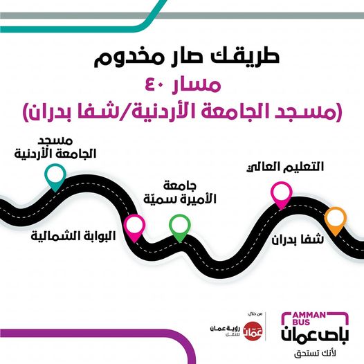 نيروز الإخبارية : أعلن الباص السريع، أنه اعتباراً من اليوم الأربعاء، اصبح بامكان مستخدمي الباص الوصول لوجهتهم من خلال مسار واحد، على خط رقم 40 من (مسجد الجامعة الأردنية - شفابدران- مرورا من جامعة الأميرة سمية، ووزارة التعليم العالي الى شفا بدران).