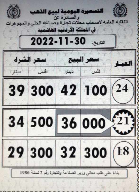 وبحسب التسعيرة الجدية الصادرة عن نقابة أصحاب محلات تجارة وصياغة الحلي والمجوهرات ، بلغ سعر بيع غرام الذهب عيار 21 الأكثر رغبة من الأردنيين بالسوق المحلية عند 36 دينارا لغايات شراء المواطنين من محلات الصاغة.
