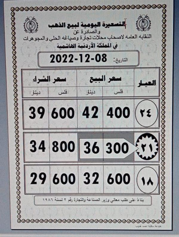 كما بلغ سعر الذهب من عيار 18 للغرام الواحد 32.60 دينارا، والذهب من عيار 24 للغرام الواحد 42.40 دينارا.