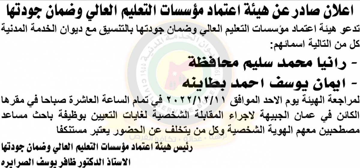 دعت هيئة اعتماد مؤسسات التعليم العالي وضمان جودتها بالتنسيق مع ديوان الخدمة المدنية مرشحين للتعيين لإجراء مقابلة شخصية وفق الإعلان التالي :