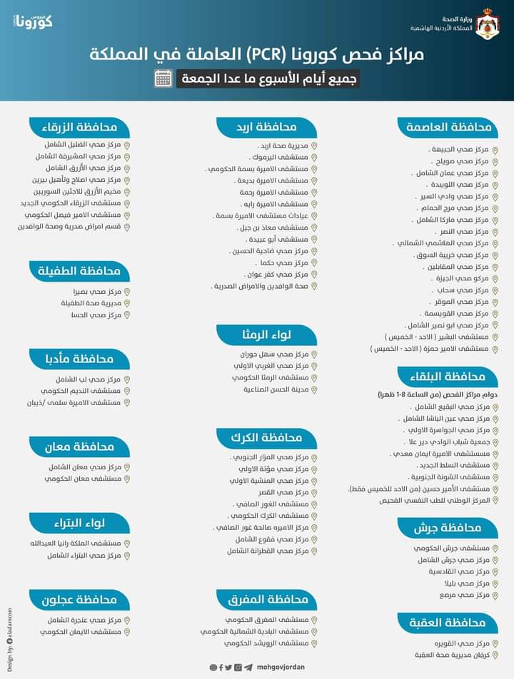 مراكز فحص كورونا (PCR) العاملة في المملكة ,جميع ايام الاسبوع ما عدا الجمعة ( من يوم السبت 2022/12/10 - الخميس 2022/12/15 ) حسب التالي: