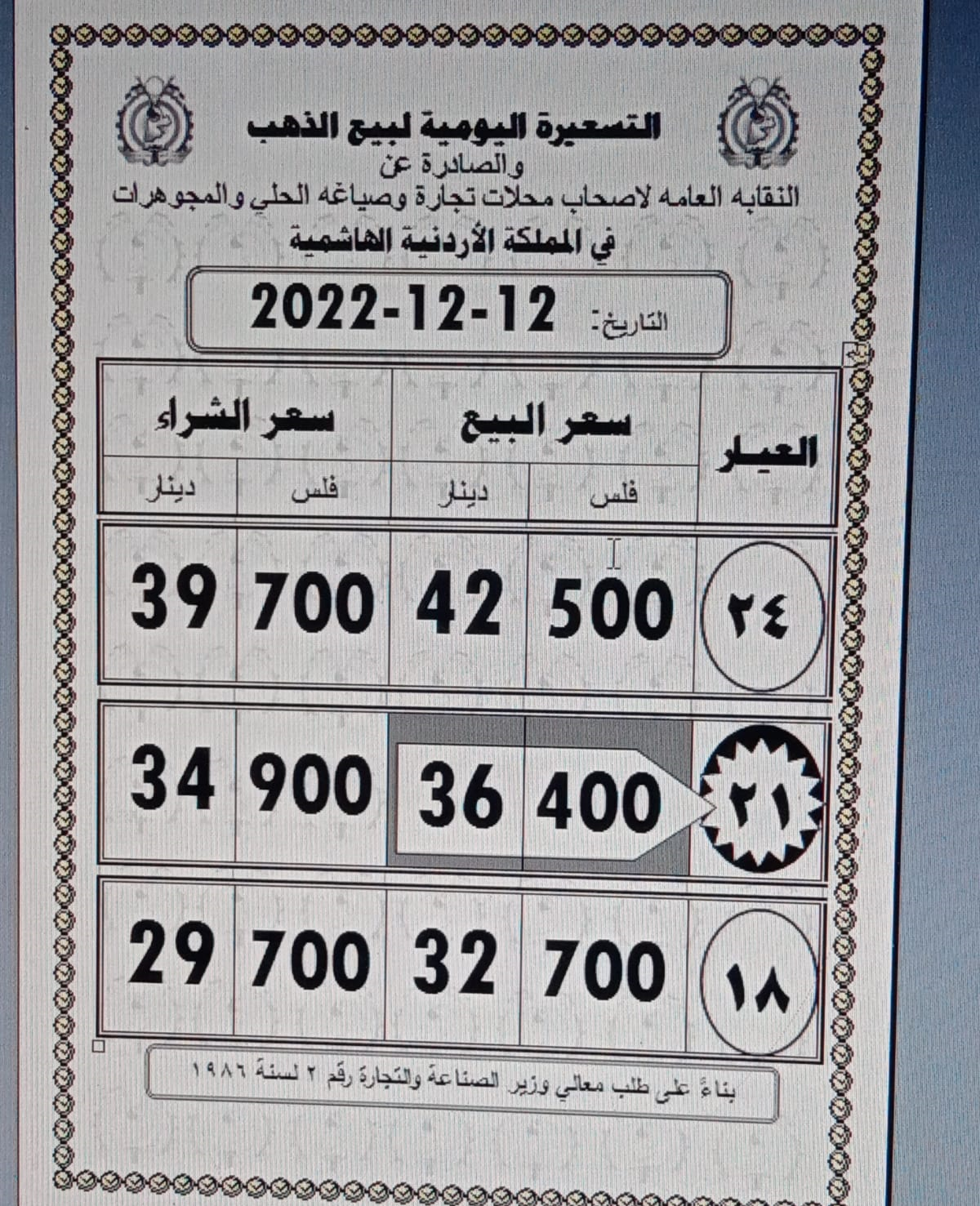 وبلغ سعر الذهب عيار 21 الأكثر طلبا من قبل الأردنيين، 36.4 دينارا لجهة الشراء من المحلات و34.9 لجهة البيع.