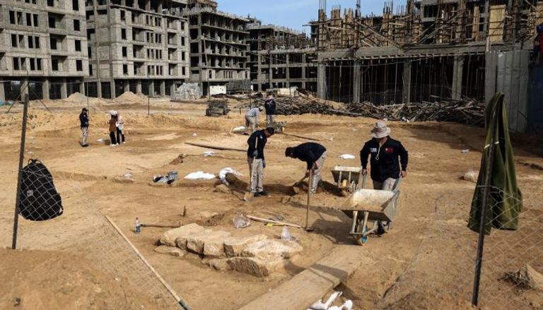 ويستخدم الفنيون أدوات بدائية وهم يقومون بأعمال التنقيب والحفر تحت الأرض، في محيط القبور التي تم العثور عليها، وذلك على بعد عشرات الأمتار من مدينة سكنية جديدة تقيمها مصر لدعم سكان قطاع غزة.
