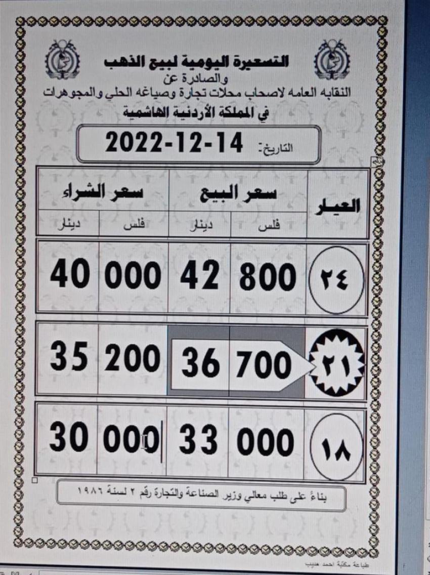 وبلغ سعر غرام الذهب عيار 21 عند 36.70 دينارا، لجهة الشراء من المحلات مقابل 35،20 دينارا لجهة البيع.