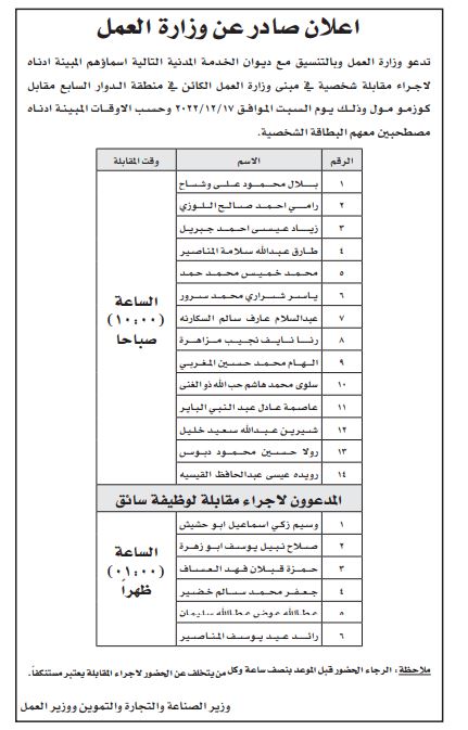 أعلنت وزارة العمل، اليوم الخميس، بالتنسيق مع ديوان الخدمة المدنية، عن دعوته التالية أسماؤهم، إلى مراجعة الوزارة لإجراء المقابلات الشخصية مصطحبين معهم البطاقة الشخصية.