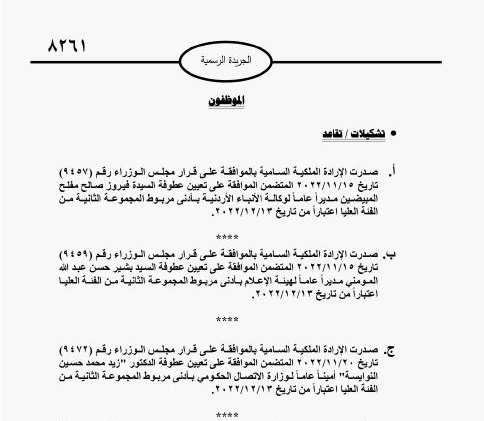 كما صدرت الإرادة الملكية السامية بالموافقة على قرار مجلس الوزراء، المتضمن تعيين بشير المومني مديرا عاما لهيئة الإعلام بأدنى مربوط المجموعة الثانية الفئة العليا اعتبارا من 13 الشهر الجاري.