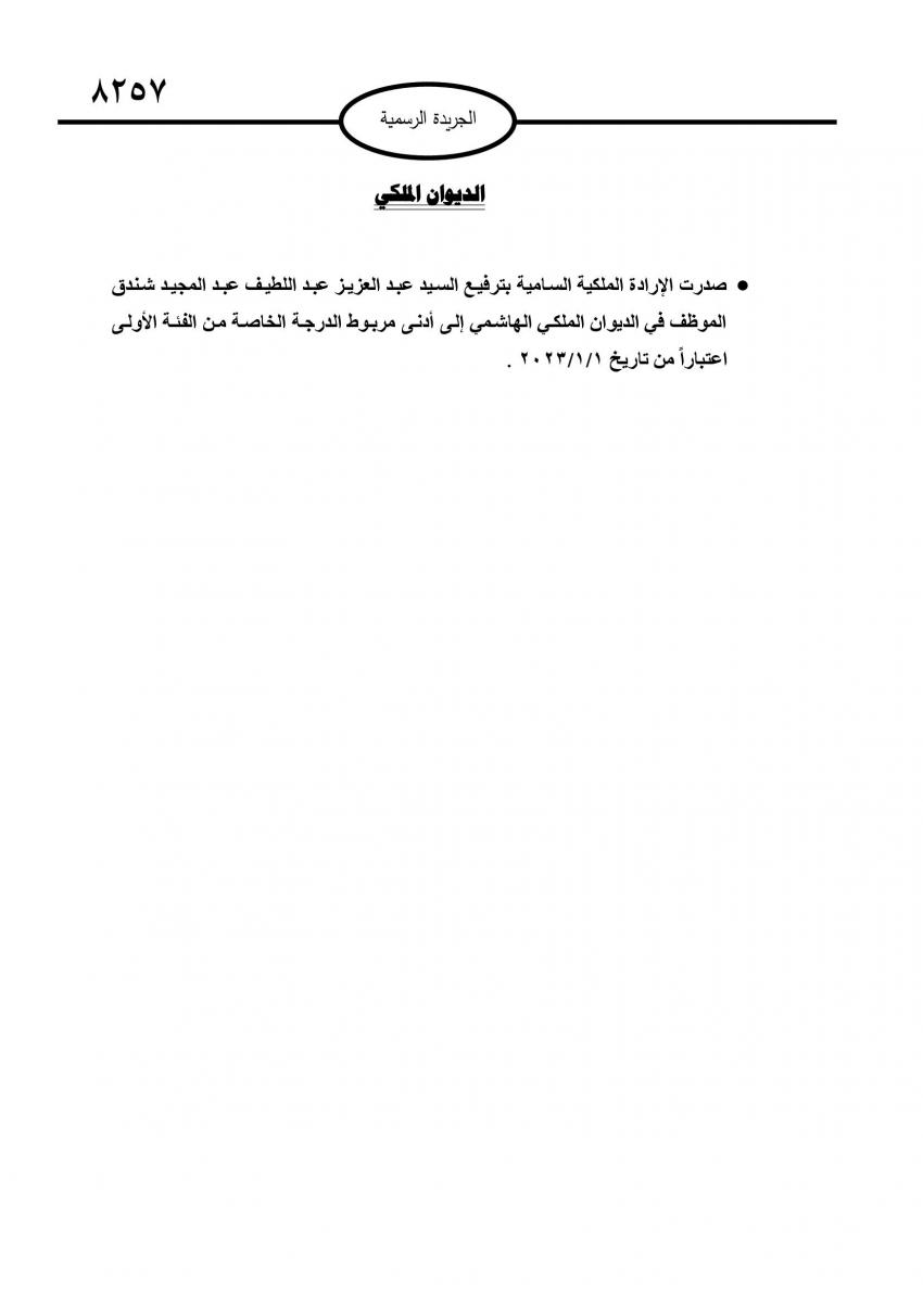 كما صدرت الإرادة الملكية السامية بترفيع السيد عبد العزيز عبد اللطيف شندق الموظف في الديوان الملكي الهاشمي إلى أدنى مربوط الدرجة الخاصة من الفئة الأولى اعتبارا من بداية العام المقبل.