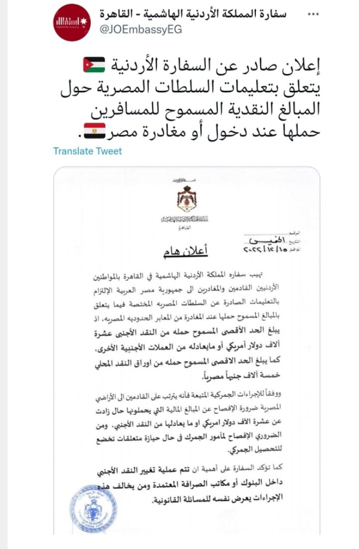 أوضحت السفارة الأردنية في القاهرة التعليمات الصادرة عن السلطات المصرية المختصة فيما يتعلق بالمبالغ المسموح حملها عند المغادرة من المعابر الحدوديه المصرية، وضرورة الإفصاح عن المبالغ المالية التي يحملها المسافر القادم إلى مصر.