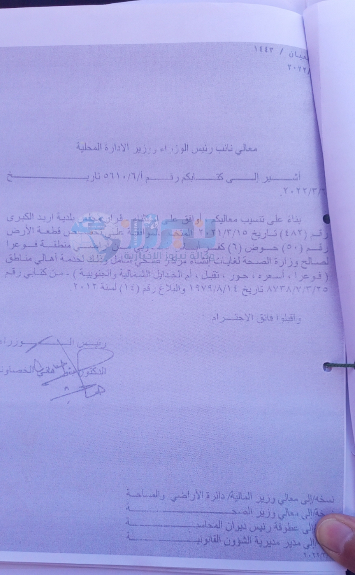 حصلت نيروز على وثيقة من النائب الدكتور زهير السعيدين يتبين من خلالها موافقة رئيس الوزراء الدكتور بشر الخصاونة من خلال كتاب موجه لنائب رئيس الوزراء وزير الإدارة المحلية على أنه تم أستثناء قرار مجلس بلدية اربد الكبرى رقم 482 تاريخ 2021/3/15 تخصيص قطعة أرض من أراضي فوعرا لصالح وزارة الصحة .
