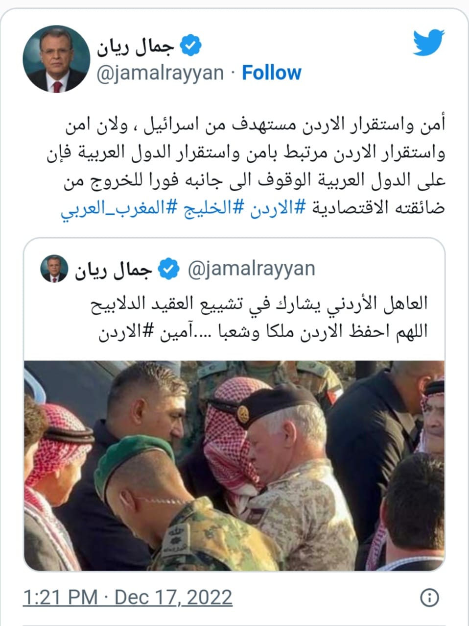 ونشر جمال ريان عدداً من التغريدات اثناء تعزية الملك بالشهيد العقيد عبد الرزاق الدلابيح معلقاً عليها: اللهم احفظ الاردن وشعباً.. آمين.