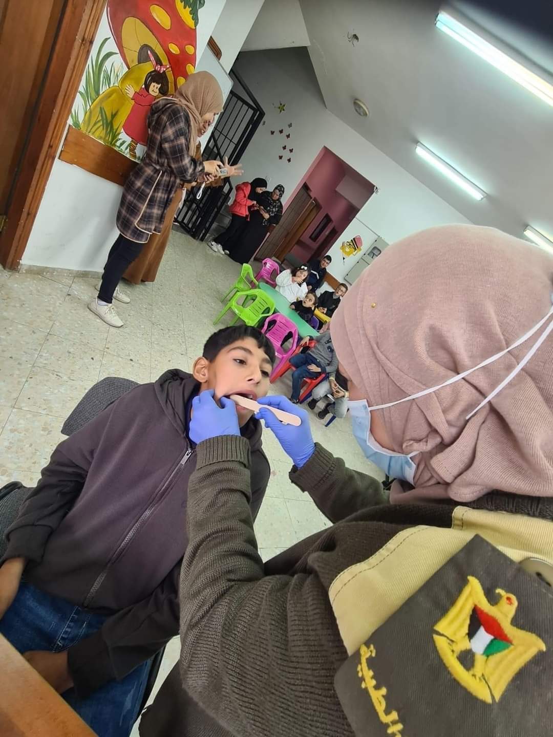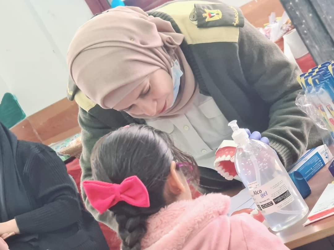 وقامت رائد طبيب أسنان /سلمى أبو الشوارب بعمل الفحص الطبي للأسنان وتقديم هدية رمزية لطلبة الجمعية للعناية بالفم.