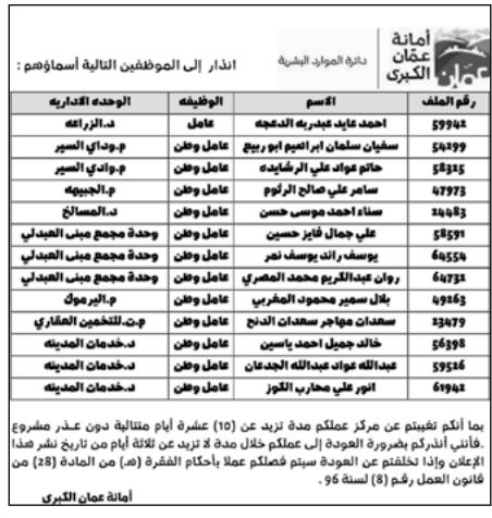 أمانة عمّان تنذر موظفين متغيبين عن العمل (أسماء)